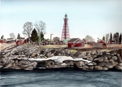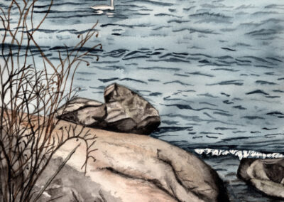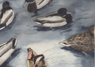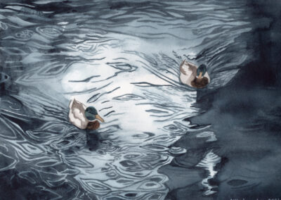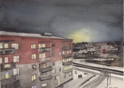 Akvareller 2021 Triss i änder Anden Åsa Skymning vid Allévägen Snöigt Stockholm Maystugan – i blått Mandarinand Hus i Gustavsberg Svan vid Getudden Vilande råbock Råbock Picasso som kattunge Vid ångbåtsbryggan Från Loftbodas veranda Lekstugan Pite-Rönnskär Gräsand Från Loftboda 2021 Hus i Simrishamn Sickla kanal Änder i Hammarby Sjöstad